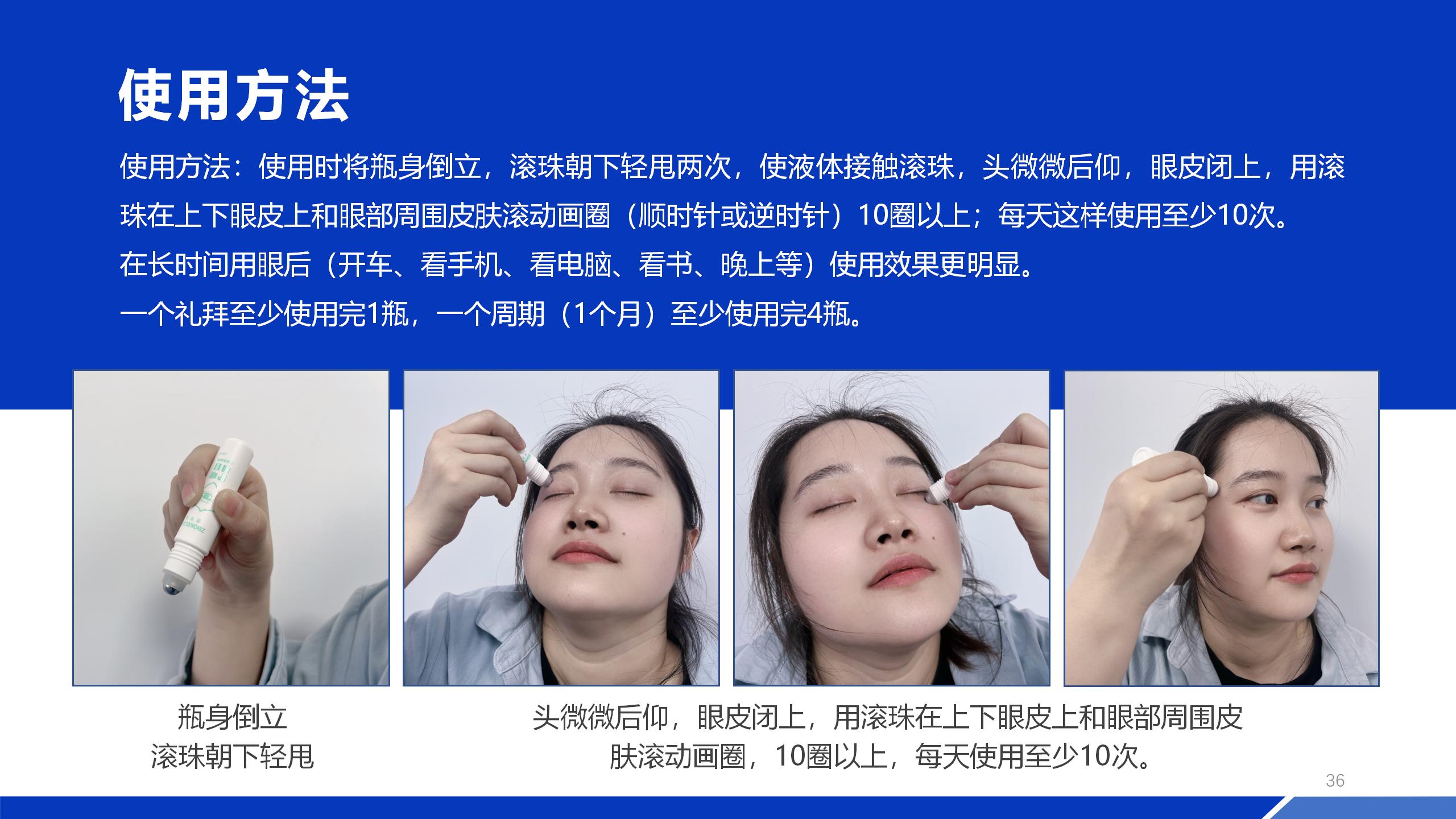 使用時,產(chǎn)品內(nèi)含的液體不直接進(jìn)入眼球,僅需閉眼后,使用滾珠在眼皮及眼部周圍肌膚上按摩滾動、畫圈十圈以上,對眼睛沒有任何刺激和傷害。有效成分即可快速透皮吸收,經(jīng)過人體皮膚選擇性的滲透到達(dá)眼睛里面,效果立竿見影,體驗(yàn)感非常強(qiáng),可以長期安全使用,解決各種眼疾問題。