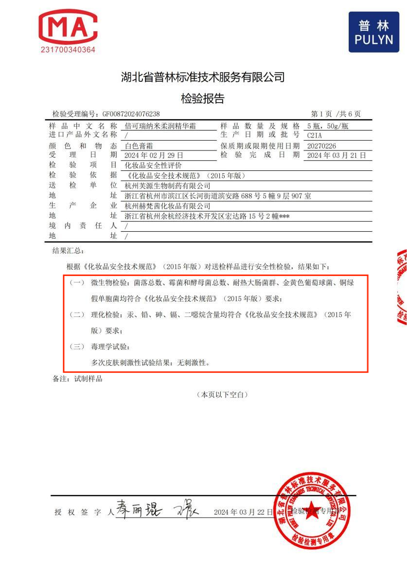 納米柔潤精華霜產(chǎn)品檢驗(yàn)報(bào)告