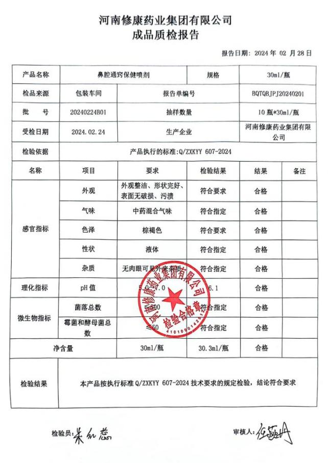 鼻腔通竅保健噴劑檢測報告