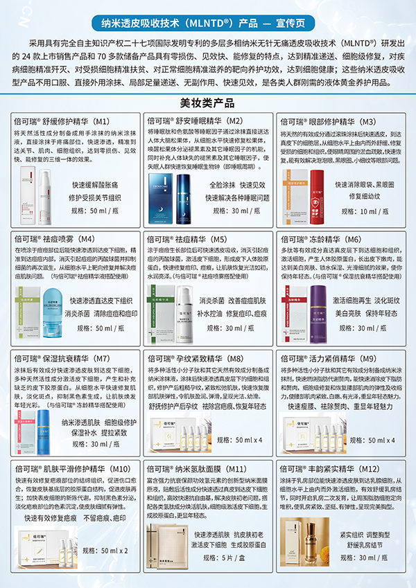 公司核心專有技術(shù)是創(chuàng)始人張伯科博士發(fā)明的納米透皮吸收專利技術(shù),在不改變分子結(jié)構(gòu)的前提下,創(chuàng)建了與細胞結(jié)構(gòu)相類似的多層多相納米細胞粒體系。納米細胞粒所特有的納米量子隧道效應(yīng)能快速穿透皮膚和組織,將其攜帶的有效成分層層遞送到達細胞內(nèi),從根本上解決了生物活性大分子難以透皮吸收的國際難題。