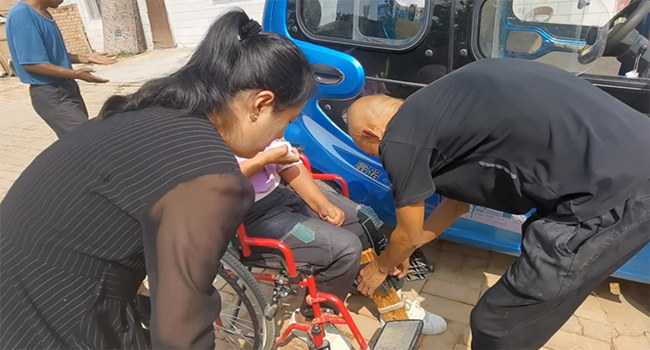 第一次見到他時(shí),他開著一輛十分狹小的電動(dòng)車,膚色黝黑,穿著一件簡(jiǎn)單的黑色T恤。車子停下后,他利索地來(lái)到副駕駛拉開車門,轉(zhuǎn)過妻子的身體讓她面朝自己,再將她的雙臂搭在自己的脖子上,撫平她因動(dòng)作而上滑的衣角,小心輕柔地將妻子放到早已備好的輪椅上。